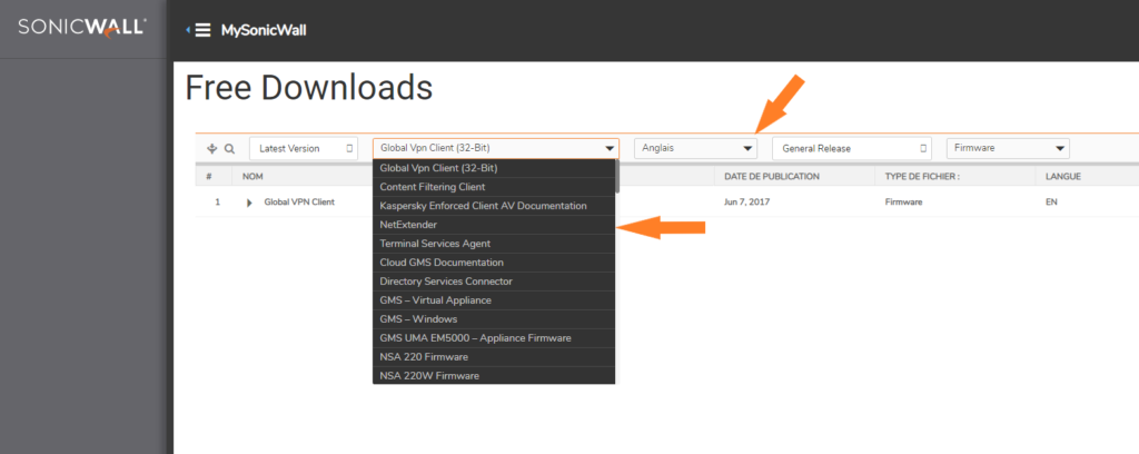 Vous n’avez ensuite qu’a sélectionner la langue “Anglais” et le produit “NetExtender“.